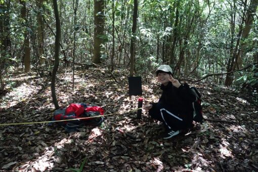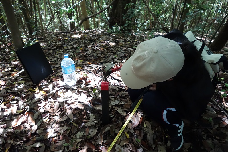 良いデータを得るためには、綿密な計画の下で、フィールドそのものをデザインすることが重要です。目印をつけながら、どの木にどの方向で何台カメラをしかけたら、目的とする哺乳類の生態がわかるのか、そんなことを森の中で考えながら、作業をおこないます。