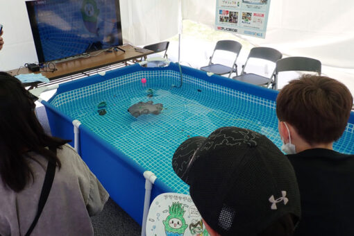 トークの隣りで行われた水中ドローンを操作して「アマモッチ」を探す体験コーナーは、子供たちに大人気。機器を使った海の調査を楽しく体験しました。