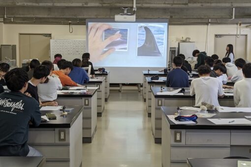 2年生を対象とした海洋生物学実験(1)は、2グループに分かれて実習を実施しています。学科教員がオムニバス形式で実習を担当しており、今回は「海洋哺乳類の個体識別」の様子を報告します。