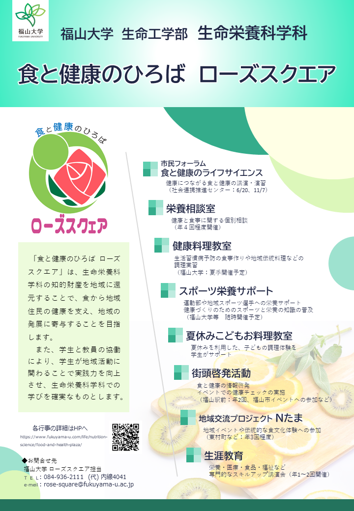 「食と健康のひろば ローズスクエア」は、健康栄養科学科の知的財産を地域に還元することで、食から地域住民の健康を支え、地域の発展に寄与することをめざします。
