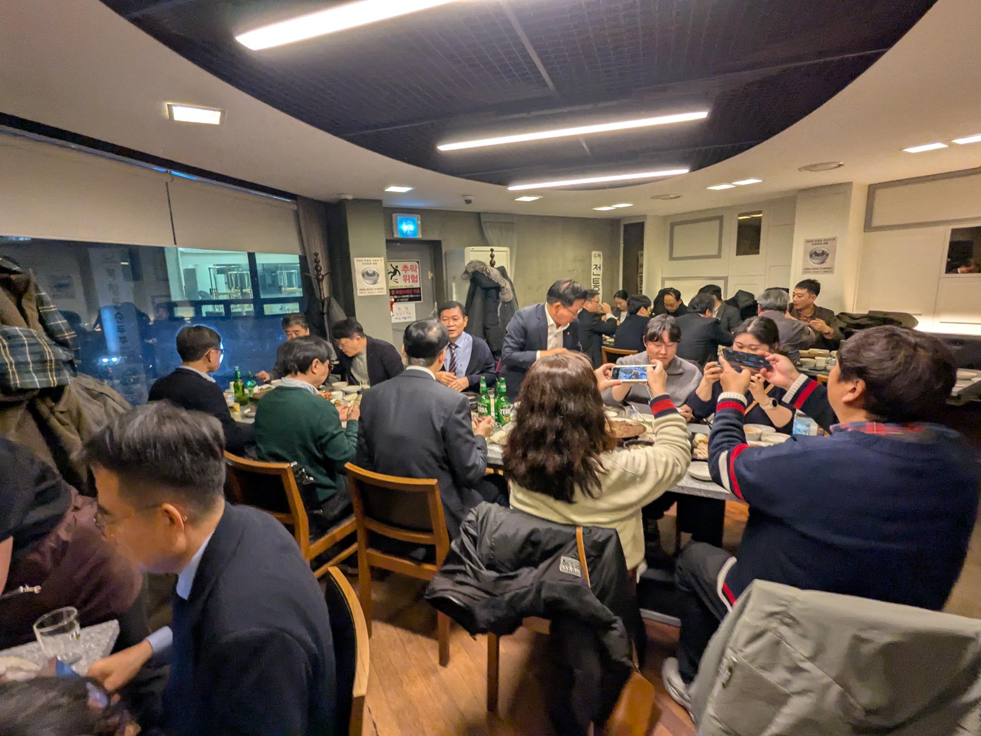 学会の前後は、先方が美味しい韓国料理の数々をごちそうしてくださいました。特に夕食はミシュラン掲載店の「ヨッチョンフェグァン(駅前会館)」で大宴会です。「韓国のおもてなし」は非常に熱烈で、テーブルいっぱいの料理を囲みながら、研究の話から互いの文化の話まで、会話が尽きることはありませんでした。また食器や化粧品、ワイヤレスイヤフォンなど、お土産もたくさんいただきました。