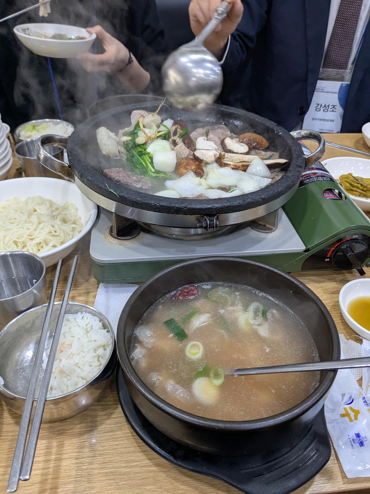 元祖新村ソルロンタンにて。前のスープだけと思っていたら、後ろの鍋も出てきてびっくりしました。