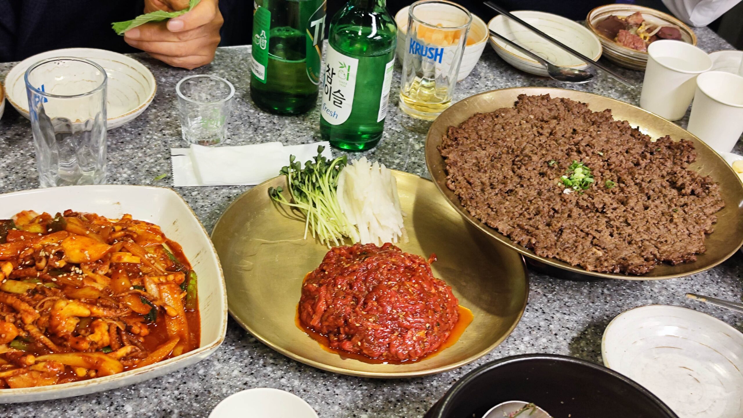 ユッケとこの店オリジナルの汁気のないプルコギ。この他にもポッサム(蒸し豚)や海鮮炒めなど、一年分の韓国料理を食べた気がします。