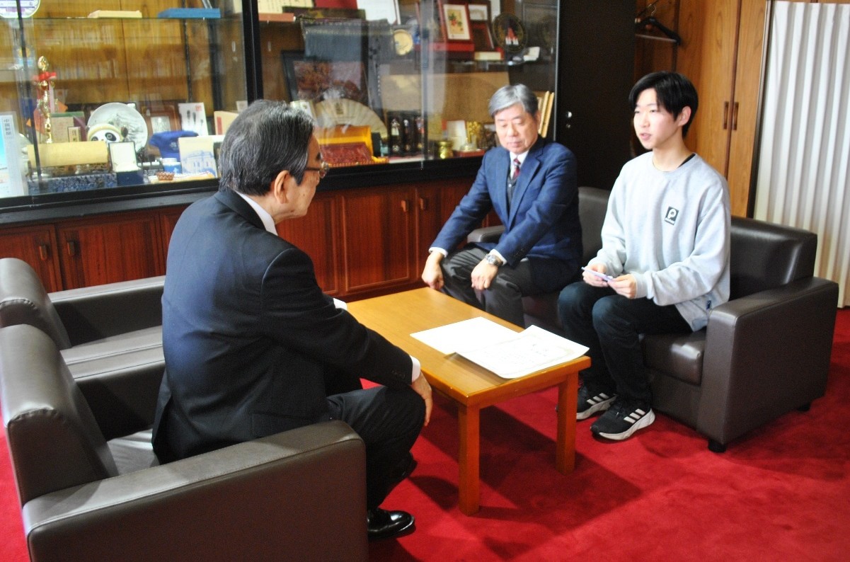 電気電子工学科の波動計測応用研究室(仲嶋研究室)4年生、原勇真さんが、「2024年度電子情報通信学会中国支部 連合大会奨励賞」と「電気学会中国支部奨励賞」を受賞し、学長室を訪問して学長に受賞報告を行いました。この報告が仲嶋教授より届きましたので、工学部電気電子工学科(フェイスブックはこちら)の伍賀が報告します。