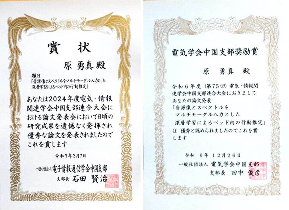 原勇真さんは、卒業研究にて、要介護者や患者がベッド内で発生させる音からその行動を推測、認知することにより、患者の離床や麻酔から覚める際に起こす点滴器具の引きはがし他、異常行動を速やかに察知して看護師に知らせることにより、介護や看護の質を向上させると共に介護士や看護師の負担を軽減することを目的とした、スマートベッドの研究を遂行しました。今回の受賞対象となった研究は、その途中経過を、本大会のニューラルネットワークのセッションで、「音源像とスペクトルをマルチモーダル入力とした深層学習によるベッド内の行動推定」と題して発表したものです。