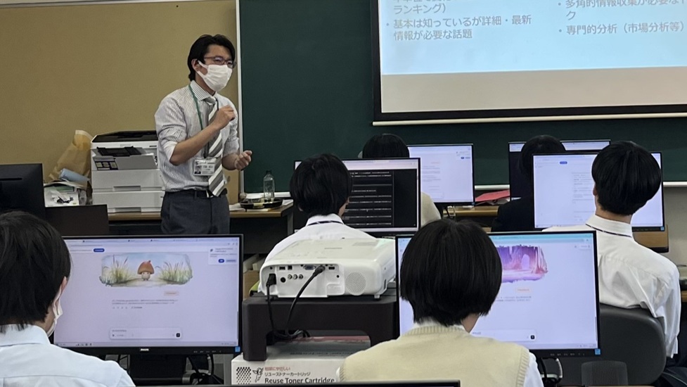 「対話型生成系AIの有効活用」について授業をおこない、AI活用の便利さだけでなく、その注意点についても演習を通して生徒の皆様に体験してもらいました。非常に活発に演習に取り組み、すばやくAIを使いこなし、楽しんでいる姿が見えて私もうれしかったです。