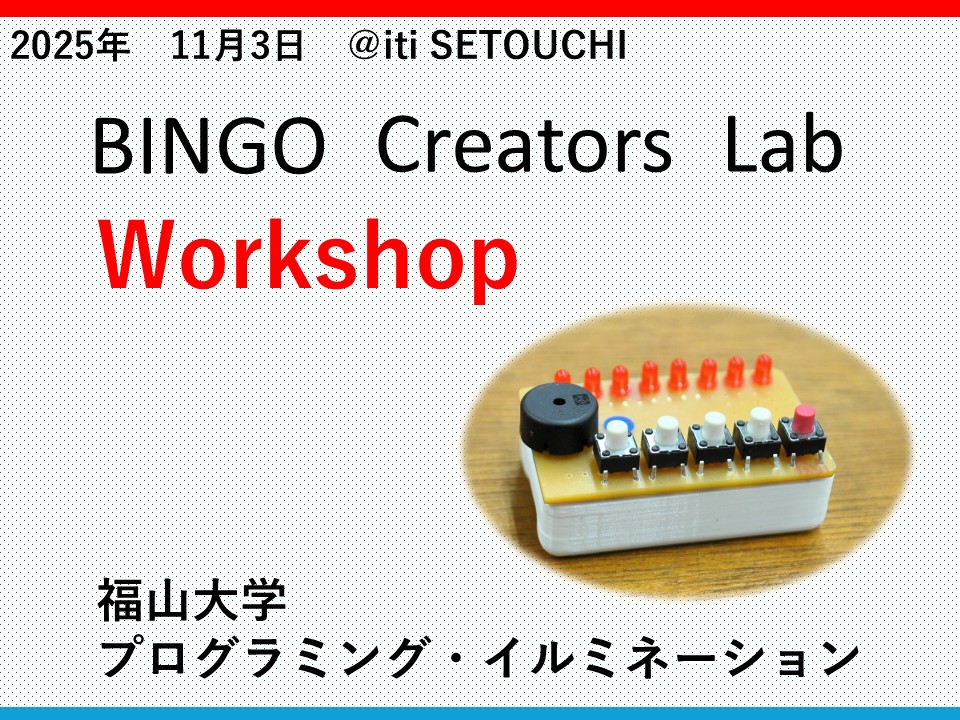 福山大学がある福山市とその周辺の市町村のクリエイティブな人・モノ・コトが一堂に集まる交流イベントである「びんごクリエイターズラボ」が11月3日に iti SETOUCHI で開催されました。福山大学工学部電気電子工学科では、3年生のMBD実習Ⅱの授業の受講学生が中心となりワークショップで工作教室を出展。また、研究生で大学発ベンチャーを進めている村上力丸君がピッチトークで日ごろの取り組みを登壇発表しました。この様子について、電気電子工学科の伍賀が報告します。