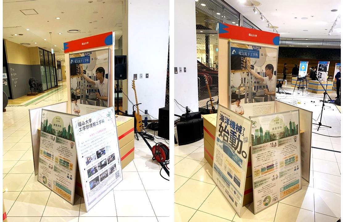 また、びんごクリエイターズラボのステージ付近では、企業・教育機関の展示紹介ブースが設けられました。そこでは福山大学工学部の4学科(電気電子工学科・建築学科・情報工学科・機械システム工学科)を紹介するため下の写真のような展示を行いました。