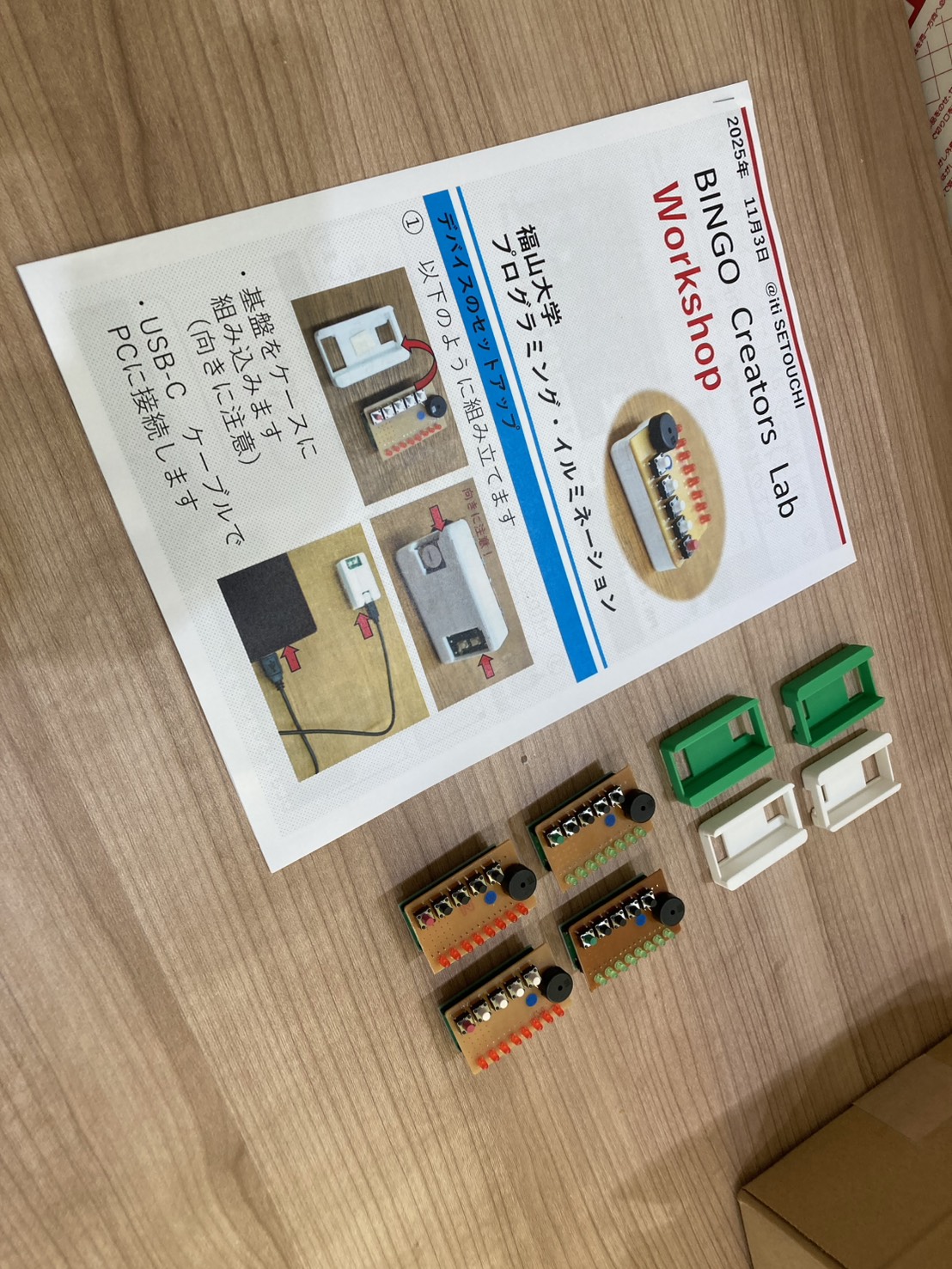 今回の工作教室では「プログラミング・イルミネーション」というテーマで上記のようなマイコンにLED・スピーカ・タクトスイッチを実装したデバイスを提案しました。このデバイスで、電子オルガンや連打ゲームのようなプログラミングも学習できます。我々の学科では、夏のオープンキャンパス体験入学に、これまで様々な工作教室の企画を実施しており、今回のデバイスもそこでのノウハウを活かしたものです。とはいえ、非常に短い準備期間と、限られた予算の中でいかに物をつくるか、というなかなか歯ごたえのある挑戦になりました。