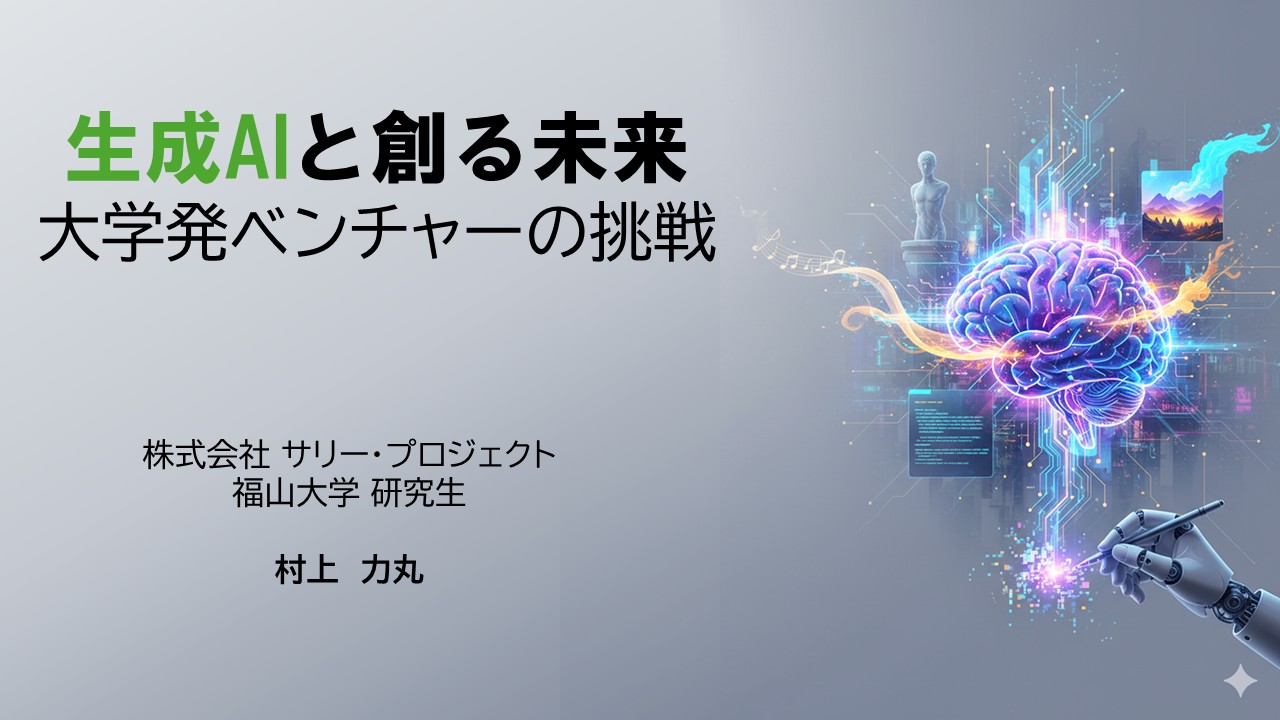 また、今回のイベントでは、15人のクリエイターの登壇発表があり、そのうちの1人として福山大学の研究生、かつ、株式会社サリー・プロジェクト開発部の村上力丸君が日ごろの取り組みを「生成AIと創る未来 大学発ベンチャーの挑戦」という題でまとめて紹介してくれました。