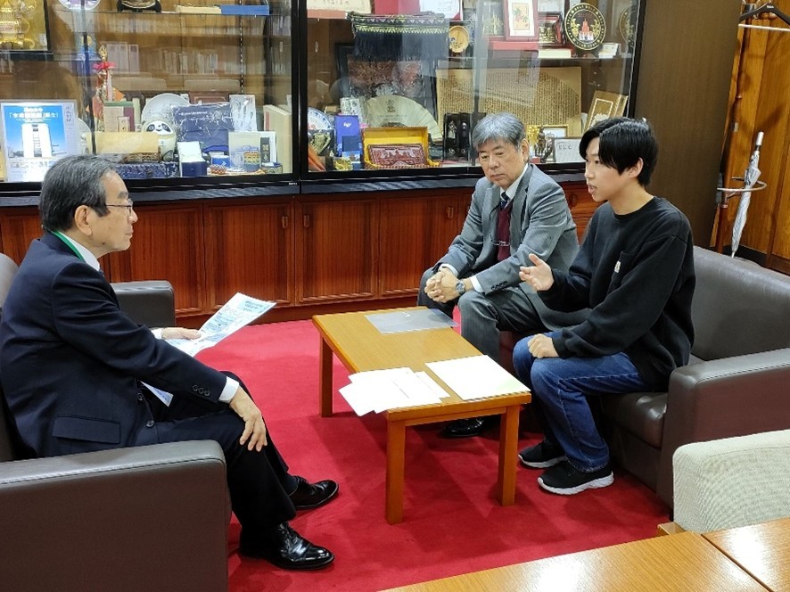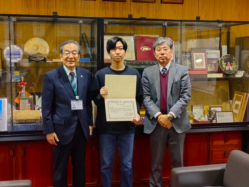 大学院工学研究科修士課程電子・電気工学専攻1年生の原勇真さん(波動計測応用研究室所属)が、令和7年(2025年)度電気学会基礎・材料・共通部門大会で「若手ポスター優秀賞」受賞し、学長室を訪問して学長に受賞報告を行いました。この報告が研究室の指導教授である仲嶋教授より届きましたので、工学部電気電子工学科(フェイスブックはこちら)の伍賀が報告します。