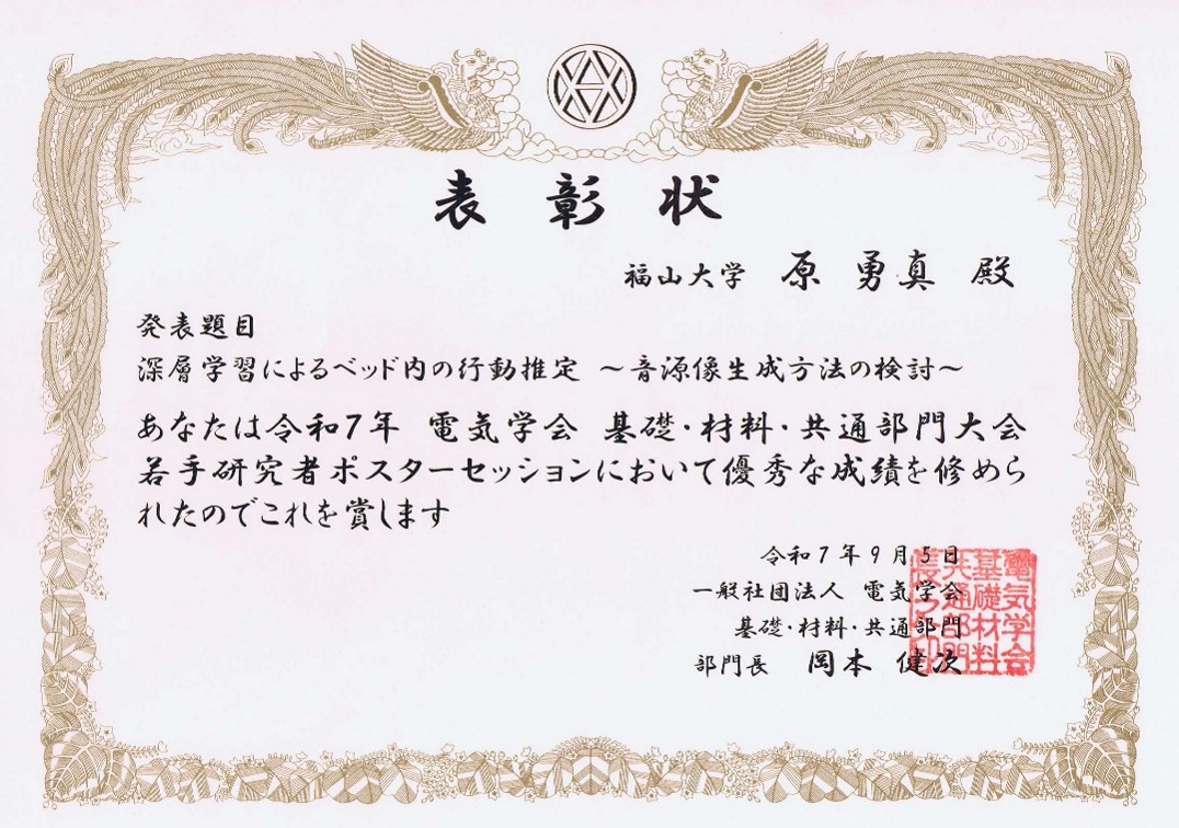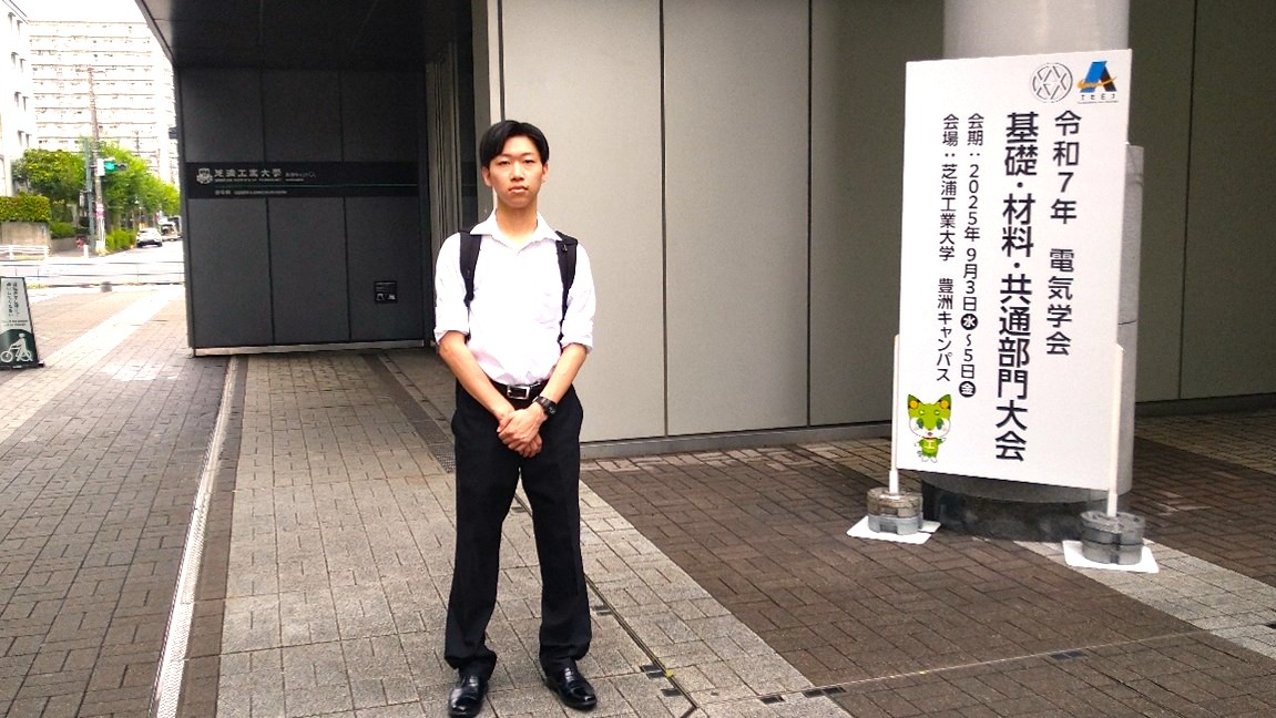 令和7年(2025年)度電気学会基礎・材料・共通部門大会が、9月2日(水)~9月4日(金)に、芝浦工業大学豊洲キャンパスにて実施されました。本大会で発表した電気電子電子・電気工学専攻1年生の原勇真さんが、「若手ポスター優秀賞」を受賞しました。