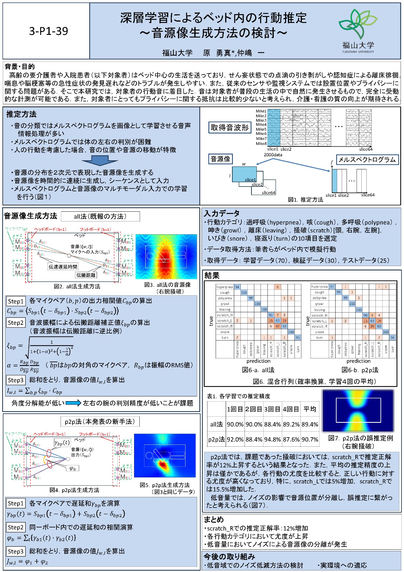 原勇真さんは、学部生の時より、要介護者や患者がベッド内で発生させる音からその行動を推測し、認知による離床や麻酔から覚める際に起こす点滴引きはがし他、異常行動を察知して看護師に知らせることにより、介護や看護の質を向上させると共に介護士や看護師の負担を軽減することを目的とした、スマートベッドの研究を継続しています。大学院では、学部生での研究を発展させて音源の位置を示す音源像の演算手法を改良し、掻破音(肌をかく音)の位置特定精度を向上させました。本件は、この成果について、「深層学習によるベッド内の行動推定 ~音源像生成方法の検討~」と題して発表したものです。