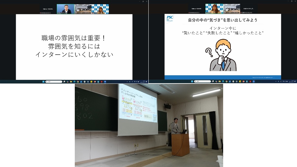 11/10(月)の情報工学科2年の必修科目の中で、島根県授業支援型交流事業として情報系の採用がある株式会社日本ハイソフト、株式会社ピーエスシーの2社から2年生向けに「インターンの重要性」について出前授業していただきました。