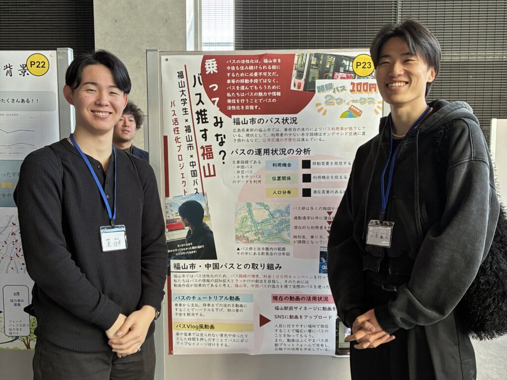 その後、福山市や広島県にヒアリング調査を行い、それぞれの自治体が抱える課題を抽出し、「交通班」と「観光班」に分かれて、解決のための提案や活動を行いました。