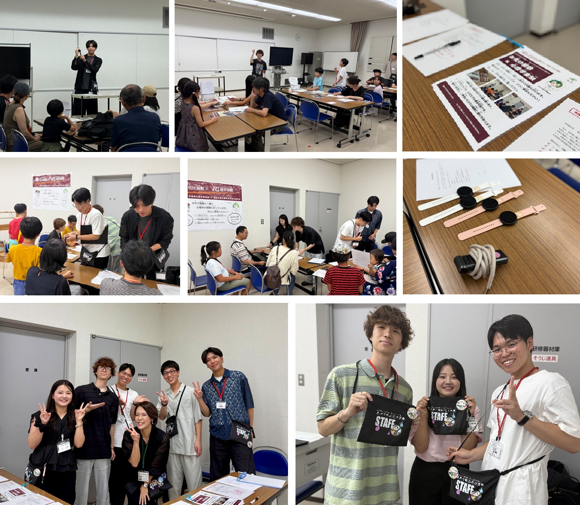 <実験について説明している様子。右下は、今年作成したスタッフ用のサコッシュ。>