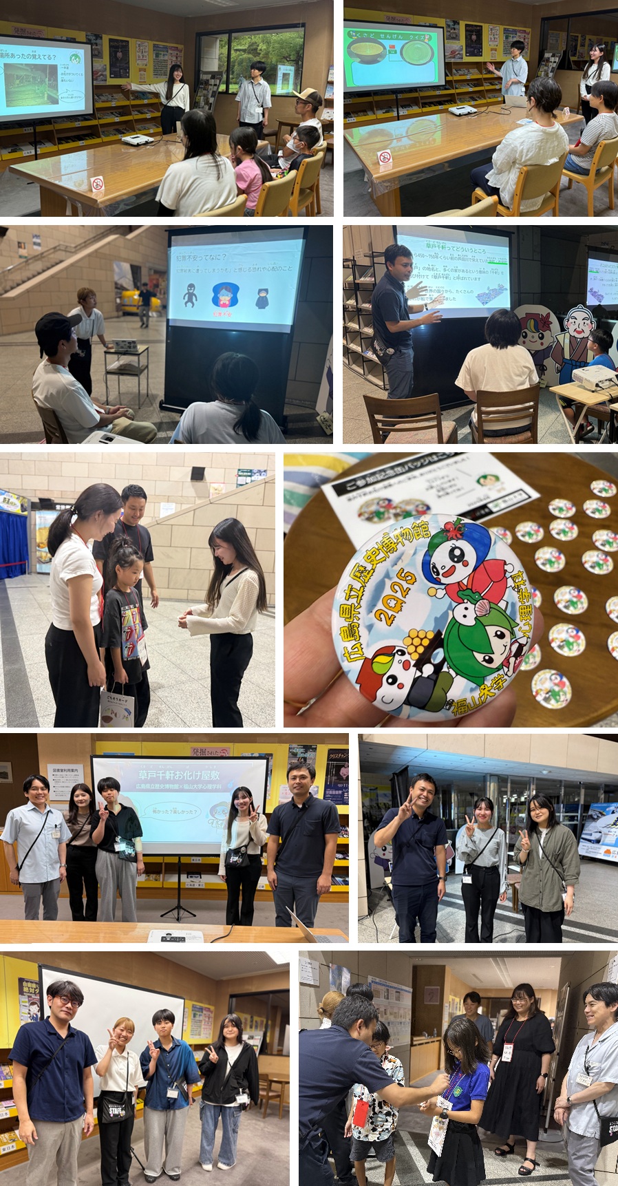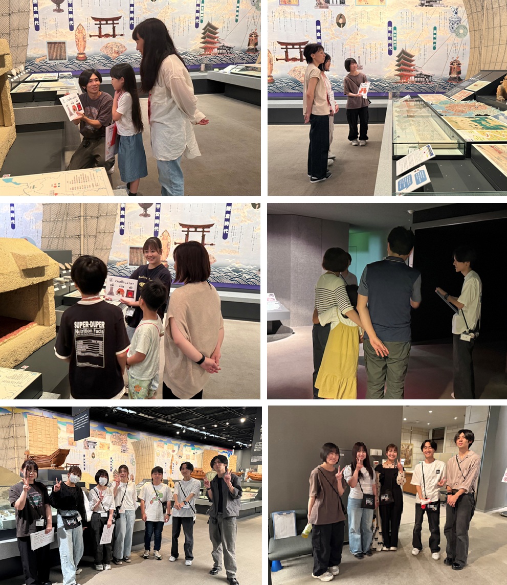 <歴史や心理学の話をする学生スタッフや学芸員さんの様子。オリジナル缶バッチもプレゼントとして渡しました。>