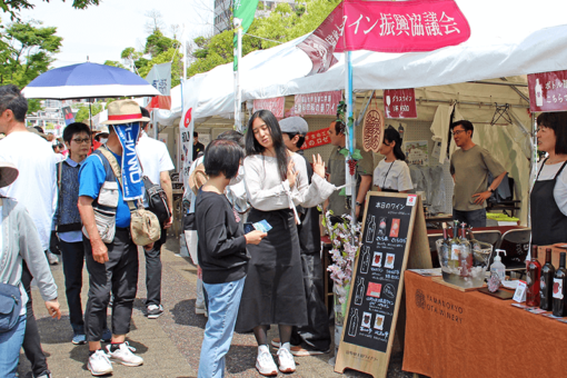福山駅南口にて4月26~27日に開催された世界バラ会議福山大会の関連イベントふくやま駅前マルシェ2025にて、先に記者発表したとおり山野峡大田ワイナリーさんと共同開発したワイン「さくら」の先行販売を行いました。