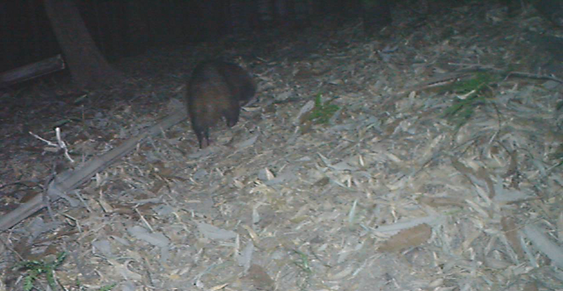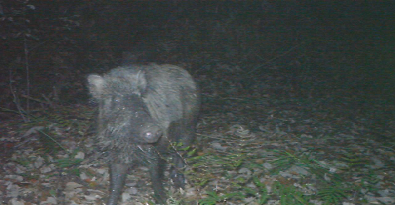 自動撮影カメラには赤外線を感知するセンサーが内蔵されており、カメラの前を熱を持ったものが通るとそこから発せられる赤外線を感知し、動画や静止画を撮ることができます。今回は30秒間の動画を撮影しました。カメラを設置して5日間待ち、その後、カメラからSDカードを取り出し、自分のPCで、イノシシほか、野生動物が撮影されているかどうかを調べます。一つ一つ動画を確認して、動物がいるかいないかを確かめる時には、わくわくしますね。「いた!」という声が実験室に響きました。結果、どの班もイノシシを撮影することに成功したようです。大学周辺にはイノシシが多いようですので、暗くなってからキャンパス周辺を歩くときには、注意しましょうね。中にはイタチ科のニホンアナグマ(下の3枚目の写真)を撮影できた班もありました。アナグマも毎年キャンパス内に姿を見せる動物です。