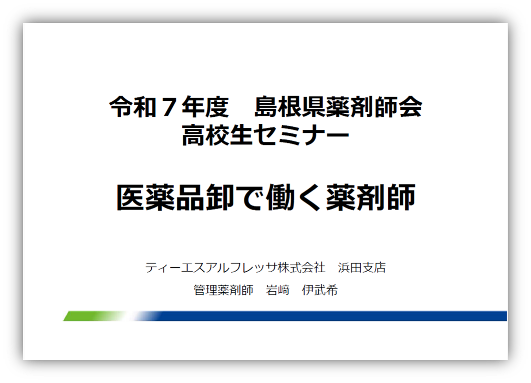 さらに、島根県内で活躍中の薬剤師から、行政勤務薬剤師、医薬品卸勤務薬剤師、薬局勤務薬剤師、病院勤務薬剤師について紹介が行われました。医薬品卸勤務薬剤師の紹介は、令和2年度の本学卒業生で、現在、ティーエスアルフレッサ(株)浜田支店に勤務している岩崎伊武希氏が担当でした(スライド1)。