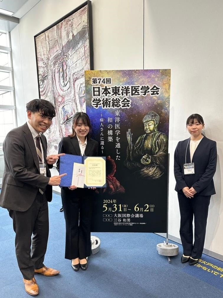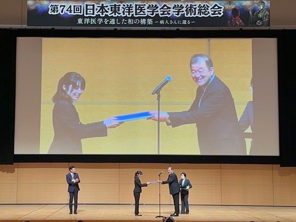 2024年5月31日(金)から6月2日(日)までの3日間、大阪国際会議場にて開催された第74回日本東洋医学会学術総会において、本学部6年生の福島彩花さんが自身の取り組んでいる課題研究の内容を口頭発表し、選考委員会による審査を経て、最も優れた発表に贈られる「会頭賞」を受賞し、表彰されました。