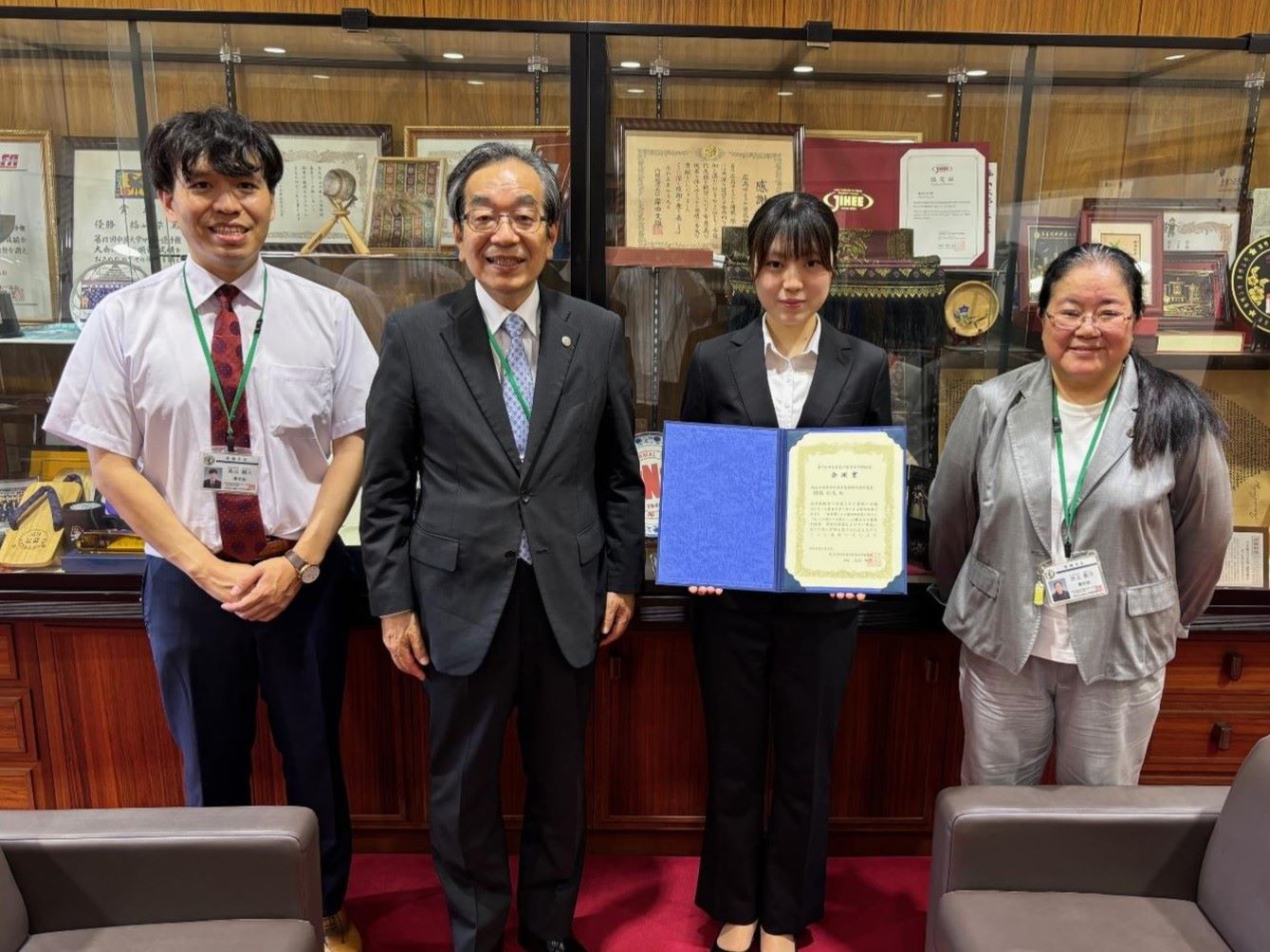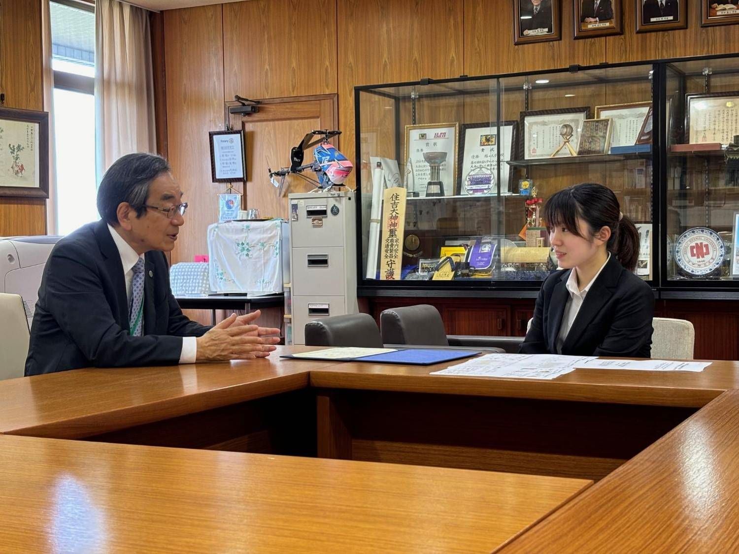 本表彰にともない、井上薬学部長とともに大塚学長に表彰の報告を行いました。福島さんから研究の背景や結果などについて説明し、さまざまな質問や激励をいただきました。