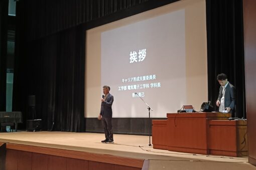 冒頭で福山大学キャリア形成支援委員長の香川直己教授(工学部 電気電子工学科)より挨拶がありました。「昨今は深刻な人手不足により企業の採用活動が早期化するなど、労働市場や世の中全体が慌てふためいており、その中で学生自身も慌てて就職活動をするとミスマッチにつながりかねない。そうならないためにもインターンシップに参加し、大学で学んでいること(新入生はこれから学ぼうとしていること)が社会に出て何のために役立つのか身をもって体験することで、自らの学びに自信をもってほしい」という端的な言葉の中にインターンシップの本質を捉えた力強いメッセージが伝えられました。