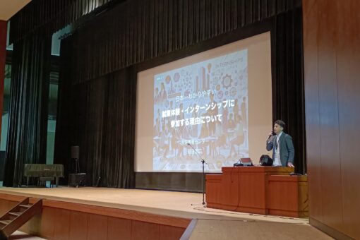 続いて、大学教育センターの前田吉広准教授より、「日本一わかりやすい 就業体験・インターンシップに参加する理由について」と題して、全国的に就業体験・インターンシップに参加する大学生が急増している現状とインターンシップに参加する意義、そしてBINGO OPEN インターンシップの特徴やメリットについて説明がありました。タイトルに「日本一わかりやすい」とあったとおり、とてもわかりやすい説明で、学生たちは前田准教授の話を真剣な表情で大きくうなずきながら聞いていました。