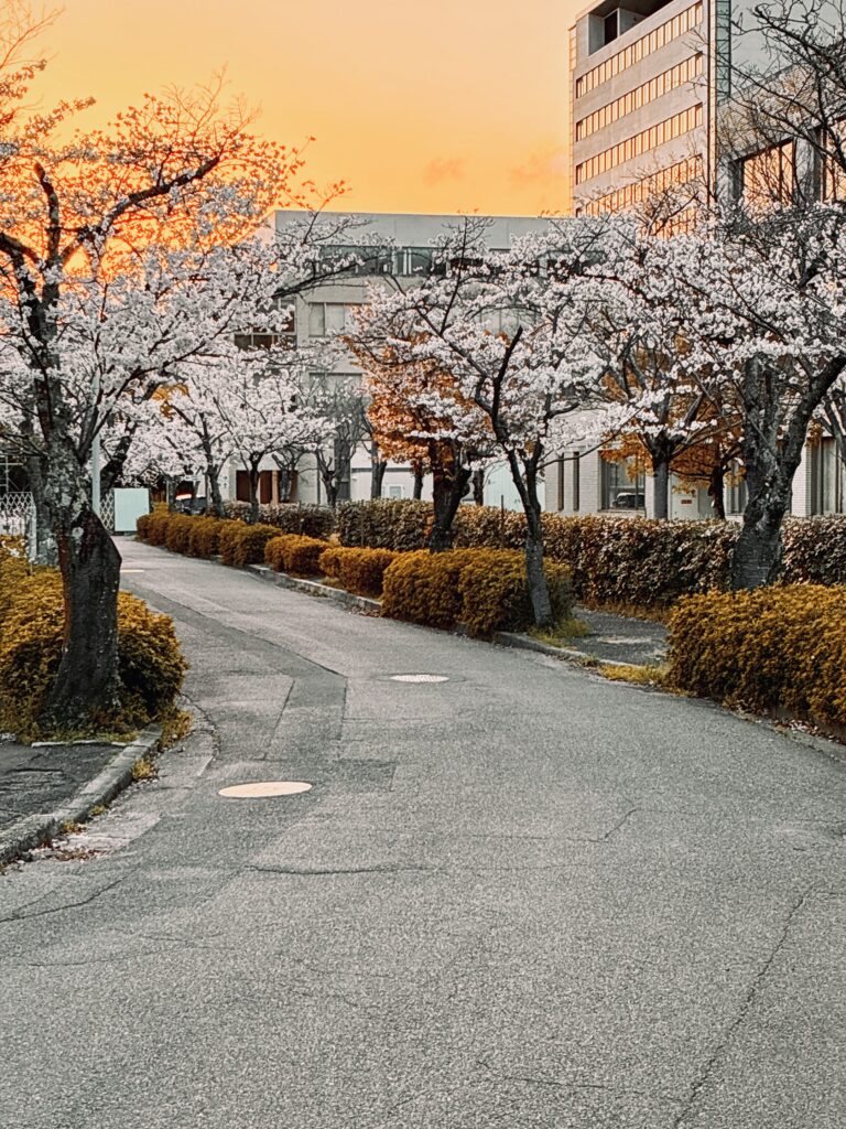 撮影者コメント:帰り道に夕日が桜の道にちょうど、ぴったりはまったので思わず撮った1枚です。