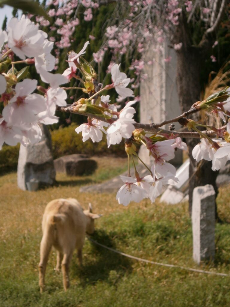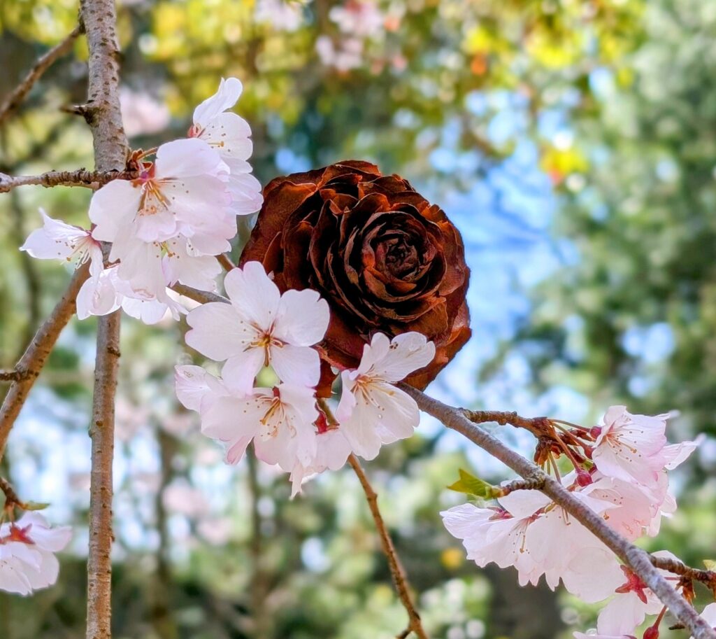 撮影者コメント:薄っすら背景の右端に見えるヒマラヤスギから落ちてきた「シダーローズ」(杉ボックリ)をしっかり受け止める「しだれ桜」、まさに奇跡の共演。