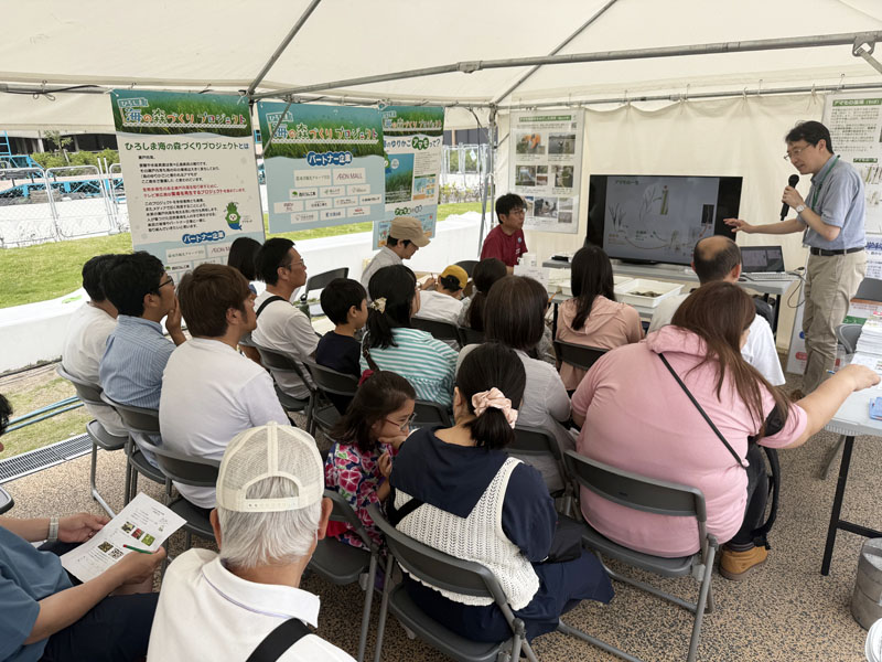 2025年6月には、広島市で開催された「ロハスピクニック広島」に「ひろしま海の森づくりプロジェクト」の展示ブースが設置され、昨年(過去のブログ)に引き続き、海洋生物科学科の山岸幸正教授が「アマモを学ぶミニトーク」の講師として参加しました。以下、その様子を山岸が報告します。