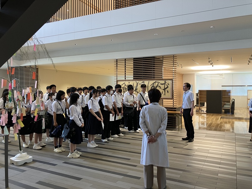 7月7日(月)に、福山市立加茂中学校からのお客様(3年生の生徒さん30名、先生お二人)が、本学を見学のため訪問されました。この見学の様子について、総務部庶務課 吉田が報告いたします。