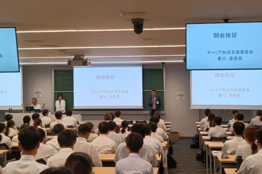 はじめに、キャリア形成支援委員長の香川教授より開会の挨拶があり、マナーや心構えを学び、実習期間中の具体的な目標を設定することが、より有意義なインターンシップにつながるという事前研修の意義についてお話しいただきました。