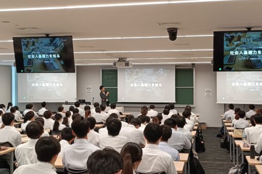 講座では、インターンシップ中に想定される具体的な場面でのマナー解説や、身体を動かしながらの実践練習が行われ、学生たちは時折メモを取りながら真剣に取り組んでいました。こうした丁寧な指導により、ビジネス現場の経験がほとんどない学生も、不安や緊張を和らげ、安心して就業体験に臨めるようになります。