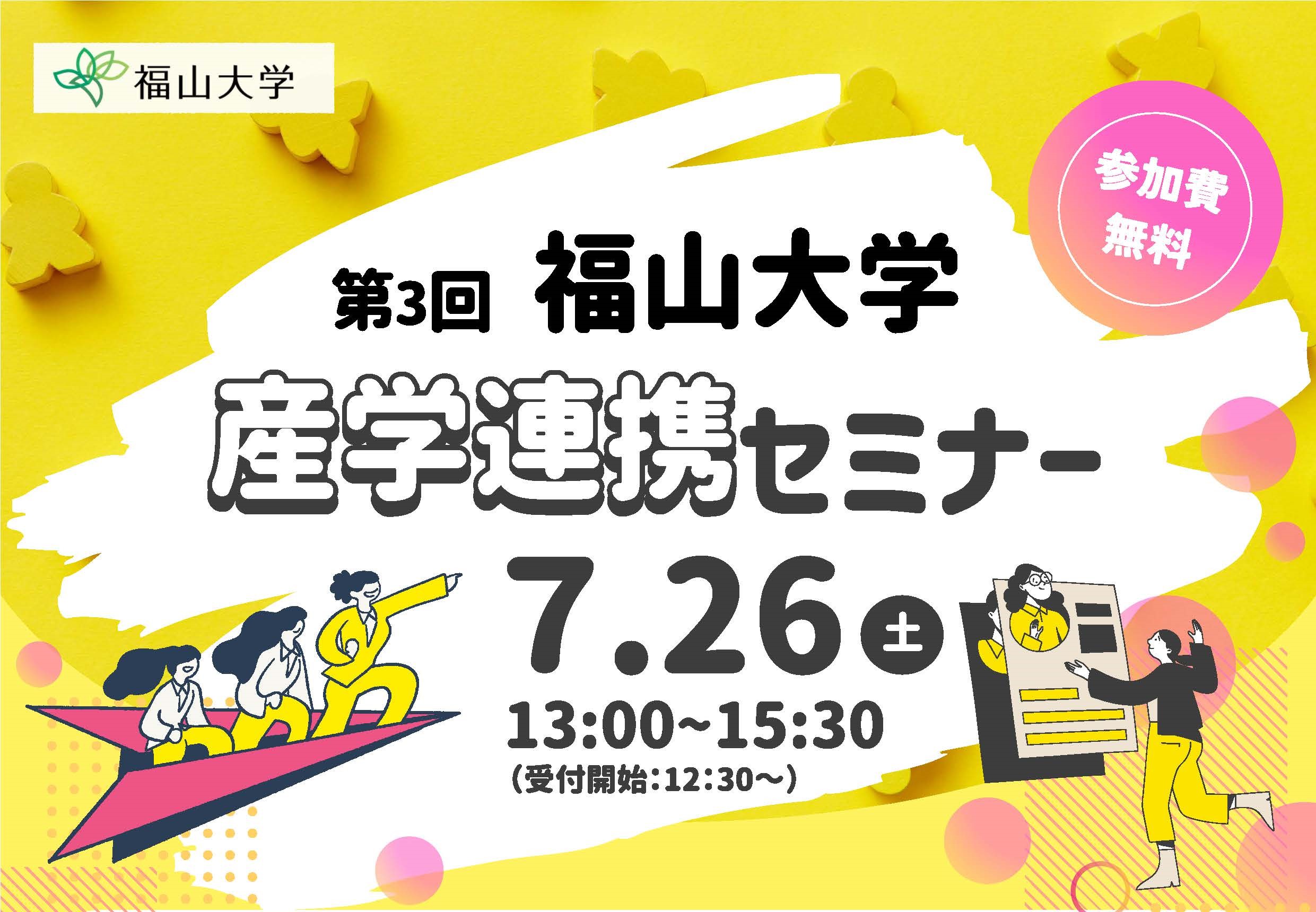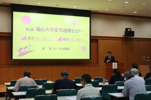 社会連携センターでは、7月26日(土)に第3回となる「福山大学産学連携セミナー」を学校法人福山大学社会連携推進センターにて実施いたしました。セミナーの開催にあたりご協力いただいた関係者のみなさまならびに当日ご参加いただいたみなさまに感謝の気持ちを込めて、「令和7年度第3回福山大学産学連携セミナー」の様子をご報告いたします。(投稿は企画・文書課)