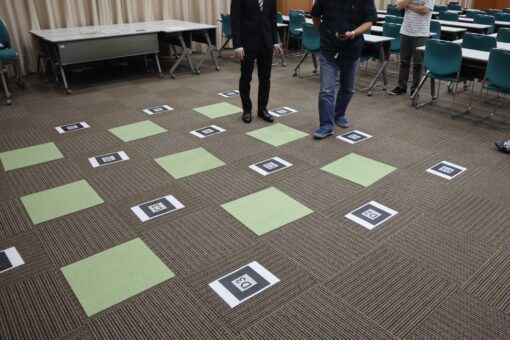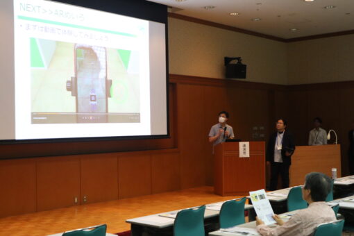 当日は、研究成果の一つ「NEXT>>AR めいろ」を会場の一角に設け、参加者に迷路を用いたAR誘導案内を体験していただきました。この「NEXT>>AR めいろ」は、AR技術による新たな誘導案内の可能性を広げる成果として、参加者にとっては、大学の先端的な学びを体験できる貴重な機会となったことでしょう。