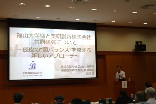 続く2講演目は、「頭皮の“菌バランス”を整える新しいアプローチ」と題して美研創新株式会社皆川豊様と福山大学薬学部薬学科道原明宏教授、丹下雅仁さん(薬学部薬学科4年生)の計3名に講演いただきました。皮膚トラブルへの新しいアプローチとして顔や頭皮に潜む常在菌に着目した研究について、3名の講師それぞれの知見が語られました。