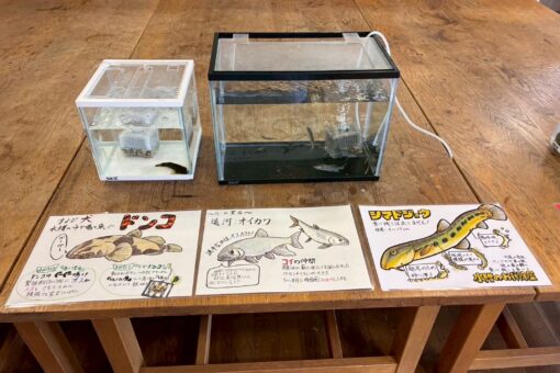 水槽には、日本の在来種であるドンコやオイカワ、シマドジョウ、イシガメを展示しました。