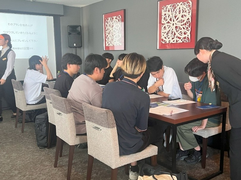 1日目は、まず尾道国際ホテルグループ様を訪問しました。おもてなしの心と、地域に根差したホテル運営の取り組みついてお話を伺いました。若手スタッフの皆さんからどのような業務を担当していらっしゃるのか、どのようなことに働き甲斐を感じるかなどのプレゼンをしていただいた後に、1泊2日の最高に楽しい旅行プランを考えるというミッションに取り組みました。