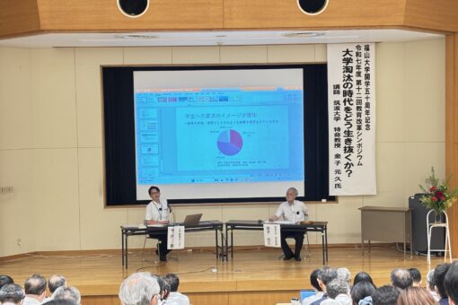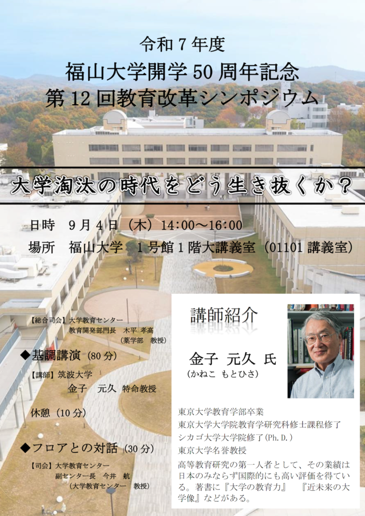 福山大学開学50周年記念事業の一環として、第12回教育改革シンポジウムが、令和7年9月4日(木)、福山大学1号館1階の大講義室にて開催されました。今回のテーマは 「大学淘汰の時代をどう生き抜くか?」 で、高等教育研究の第一人者である東京大学名誉教授・筑波大学特命教授の金子元久先生を講師にお迎えし、大学を取り巻く環境の変化と今後の展望についてご講演いただきました。その様子を、大学教育センターの前田が紹介します。