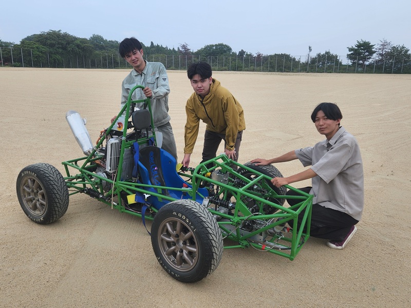 2024年度に機械システム工学科に入学した3名が、一時停滞していたフォーミュラーカープロジェクトを完成させるためのプロジェクトを開始し、約1年をかけて走行できるよう完成させました。(制作の様子は、「【機械システム工学科】フォーミュラーカー再始動!」をご覧ください。)