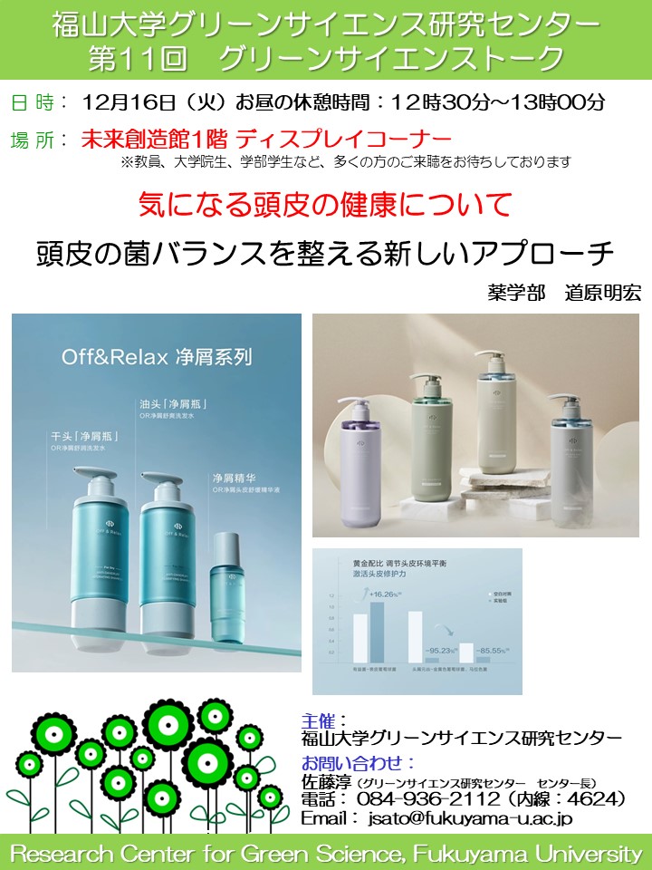 グリーンサイエンス研究センター長の佐藤です。今年もグリーンサイエンストークが始まります。グリーンサイエンストークは学部生を対象に研究をわかりやすく紹介することを趣旨としています。今年は、10月、11月、12月に以下の計3回のトークを予定しております。いずれも福山大学 未来創造館1階ディスプレーコーナーにて開催します。日時は以下のポスターをご覧ください。お気軽にお立ち寄りいただけると幸いです。もちろん学外の皆さんも歓迎します。