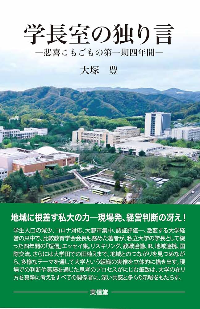 遂に、でしょうか。まさか、でしょうか。本学の学長である大塚豊教授の「独り言」が一冊の書籍となりました。その「はじめに」では「我が大学で先々代の学長から続いてきた慣行が、専任教職員に向けて発信する『学長短信』なるメッセージです」とあります。本書は、大学教育センターの所属である大塚教授が本学の学長就任以来、毎月1日に欠かさず発信していた各短信を「ほぼそのまま取り纏めたもの」で、2021年4月1日の「短信事始」から2025年3月1日の「学長室ブログ譚」までの「第一期四年間」全48話から成ります。