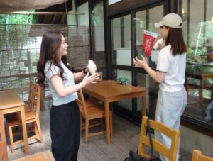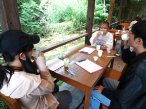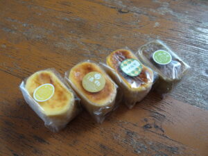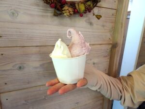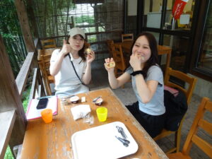 最後に牧場内で営業されているお店で商品を購入し、試食させていただきました。まず訪れたのは「上ノ原牧場 チーズケーキ」店さんです。牛乳本来の甘みと旨みをそのままに、ひとつひとつ手作りされているチーズケーキをいただきました。牛乳の味が濃くなめらかで、これまで食べたことないほどおいしいと、試食した学生は驚いていました。その他、シュークリームやプリン、ロールケーキなどを試食しました。次に「ジェラテリア カドーレ」さんを訪問しました。搾りたての牛乳を使用したジェラートは牛乳の風味そのままで、やさしい味わいでした。試食を通じて、フレッシュな牛乳を活かす加工品や料理について学び、地産地消への意欲や、上ノ原牧場カドーレの乳製品を活かしたレシピ開発への思いが高まりました。