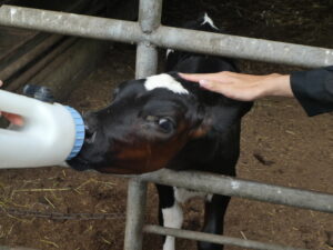 エサやり体験の後は、上ノ原牧場カドーレの職員様より牛舎をご案内いただきました。牛舎には現在13頭の牛がいて、毎日朝晩搾乳し、1頭の牛から1日30リットルも牛乳が取れるそうです。この牛乳は牧場内で加工し、牧場名物のチーズケーキを始め、ジェラート、チーズなどに加工されるそうです。私たちが訪問した際、仔牛が1頭いたため、職員様のご厚意で哺乳体験をさせていただきました。小さな牛でしたが、力強くミルクを飲んでいました。牛は1年で成牛となり、2歳で仔牛を産むそうです。成牛となった牛は6、7歳まで毎日搾乳をするそうです。こんなに近くで牛を見る機会が少ない学生は興味津々の様子で、それぞれの牛の特徴や搾乳の具体的な方法など、職員の皆様に多くの質問をしていました。