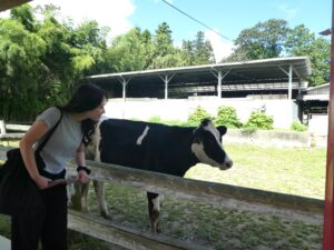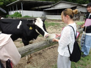 次に、牧場で飼育されている牛へのエサやり(もぐもぐ体験)をしました。牧場の牛は大きく、たくさんエサを食べます。学生・教員全員でエサやりをしましたが、あっという間に完食してくれました。牛はとても穏やかで、学生も優しく撫でながらエサやり体験ができました。上ノ原牧場では、私たちがエサやりをした屋外の飼育場だけでなく、屋内(牛舎)でもフリーバン(放し飼い)方式をとっており、牛たちが感じるストレスを軽減し乳量アップ、病気の発生を最小限に抑えることができるそうです。自由な環境で飼育されている牛だから、優しく触れ合うことができ、美味しい牛乳をつくることができると学びました。