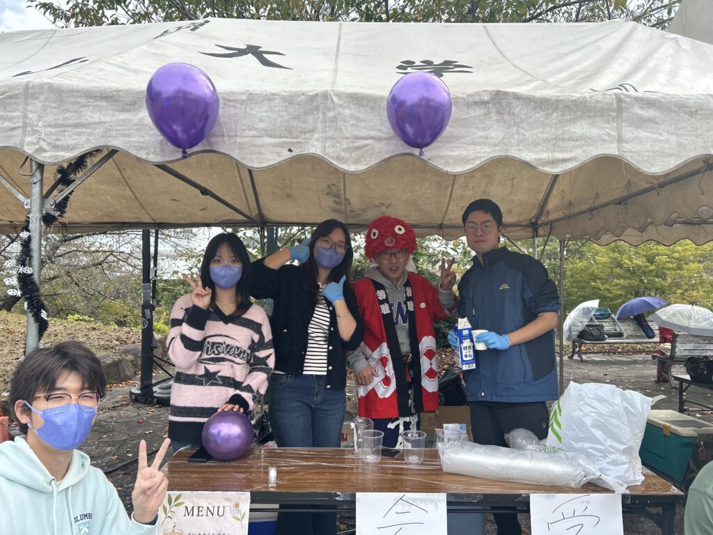 (たこ帽子をかぶっているのは足立教授です。お隣の足立ゼミのたこ焼きブースには、大変お世話になりました!)