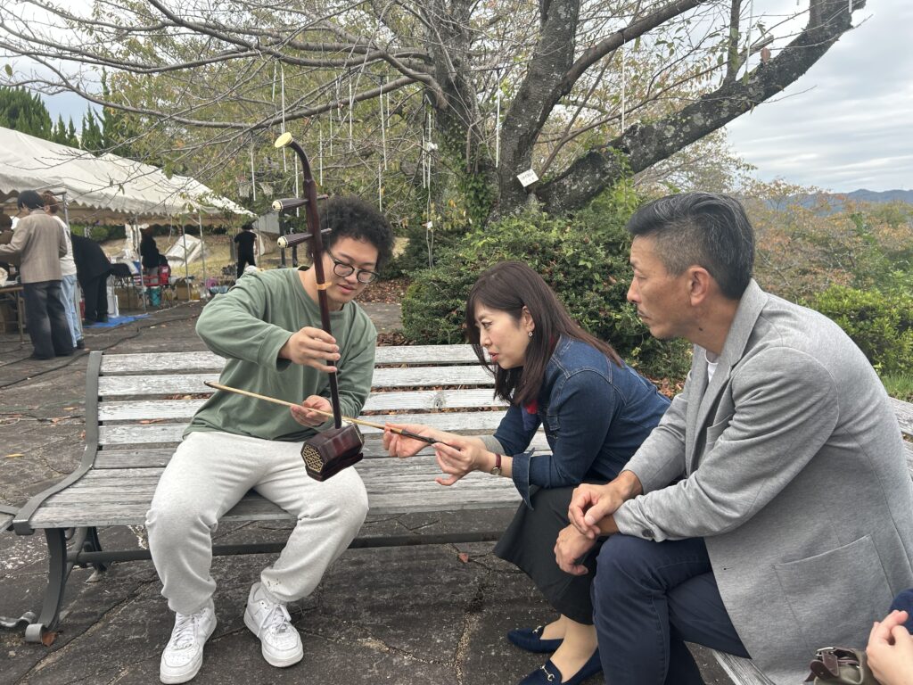 徐くんは、お客さんを呼び込むために得意の二胡を持ってきて演奏してくれました。二胡の音色に、日本人の来場者も興味津々で、聴き入っていました。
