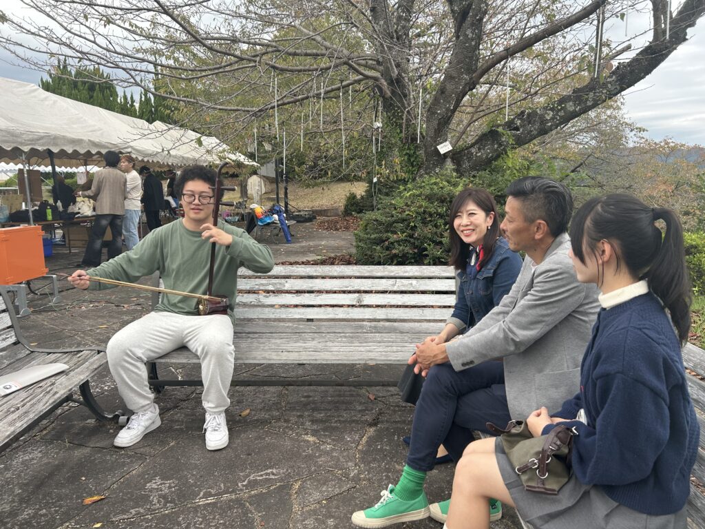 徐くんは、お客さんを呼び込むために得意の二胡を持ってきて演奏してくれました。二胡の音色に、日本人の来場者も興味津々で、聴き入っていました。