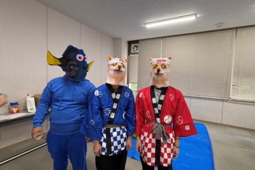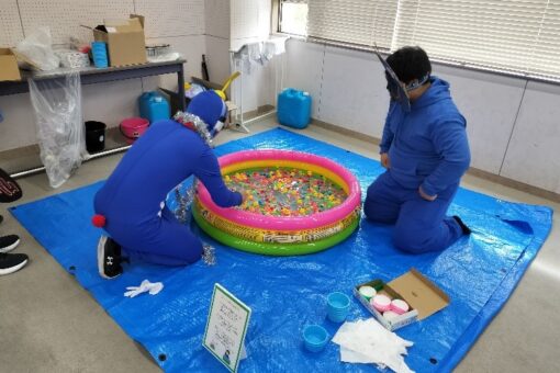 スーパーボールすくいでは、すくった分からいくつかを景品として持って帰ることができました。カラフルなボールだけではなく、アヒルや恐竜、魚の形をしたボールも多数用意していましたが、大人気で早々になくなってしまいました。接客役の学生も法被などの格好や魚などのコスプレでお祭りらしさを演出してくれました。